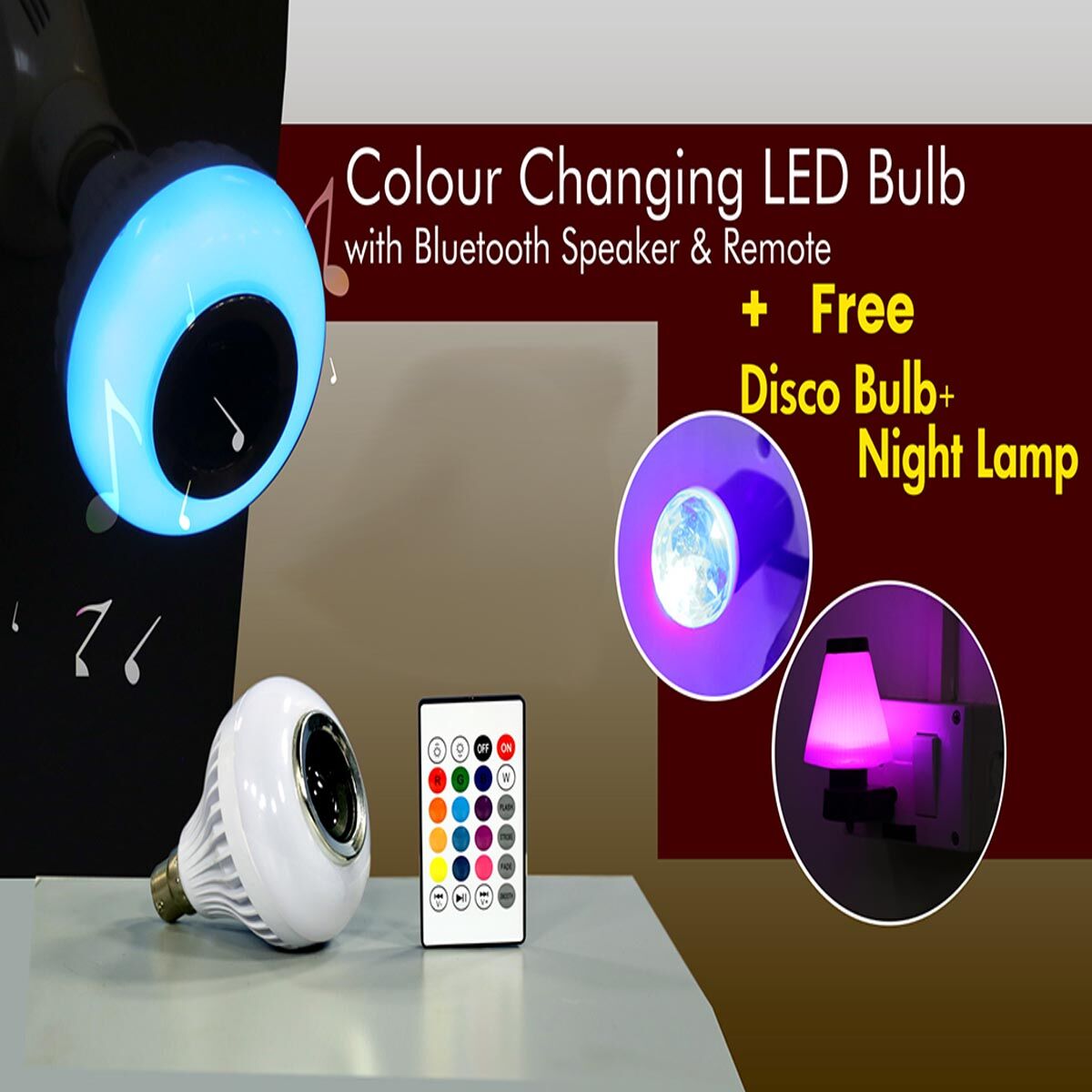 Colour Changing LED Bulb with Bluetooth Speaker & Remote + Free Disco Bulb + Free Night Lamp